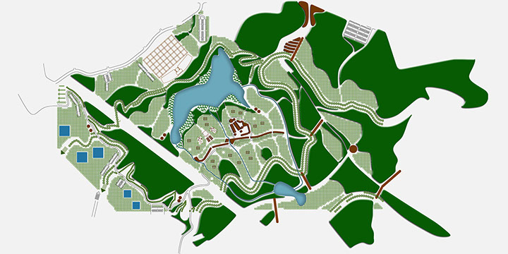 This project spans approximately 320 hectares of steep terrain and includes a mix of land uses such as small commercial complexes, a cultural center, a shopping center, administrative offices, and a hotel, all looking towards a newly designed lake. The development aims to integrate these functions with the natural landscape while promoting economic and cultural growth in the area.